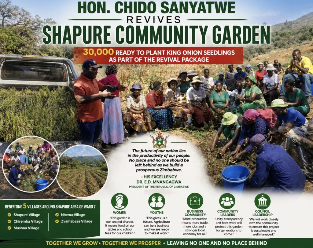 Shapure, Nyanga North — A long-dormant community asset has sprung back to life following a decisive intervention by Hon. Chido Sanyatwe, who has delivered 30,000 ready-to-plant King onion seedlings to the Shapure Community Garden as part of a broader revival package aimed at restoring livelihoods, food security, and local enterprise.